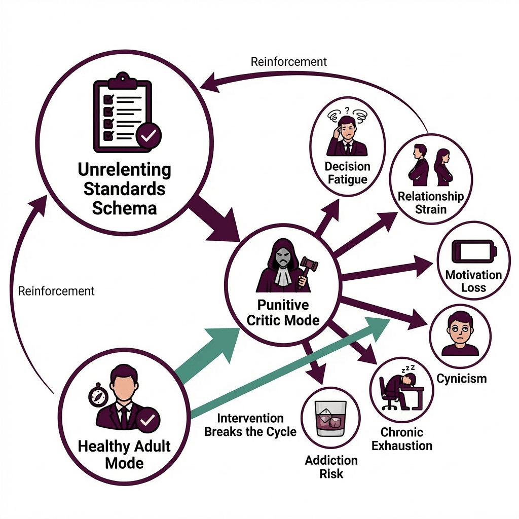 Strong schemas such as emotional deprivation, imperfection/shame, failure and insecurity are linked with higher burnout scores across emotional exhaustion, depersonalisation and reduced sense of achievement – especially in high achievers (Soygüt et al., 2009).